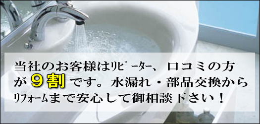 水が止まらない、水が漏れる・・・。といっても、部品を交換するだけで劇的に改善することがよくあります。しかし、修理するより、新しい商品に取替した方が得な場合もよくあるものです。当店は、お客様のお考えを尊重し、適切なアドバイスをさせていただきます。 |